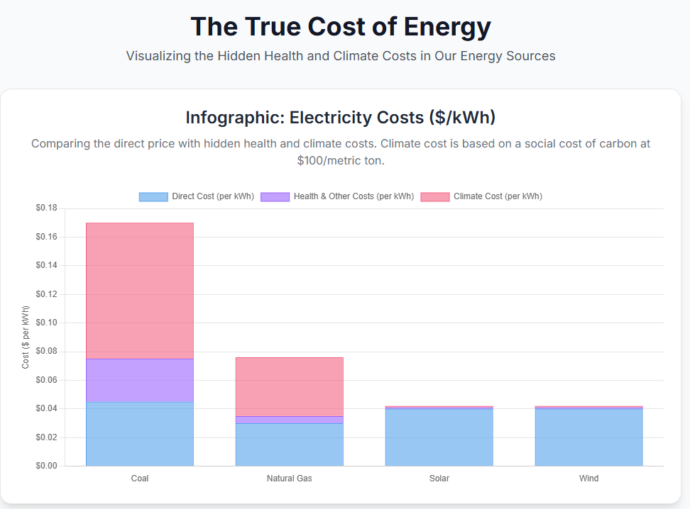 As shown in Figure 1, the true cost of coal-fired electricity is more than triple its direct cost, burdened by massive health and climate externalities. Even natural gas, often touted as a cleaner alternative, carries a true cost nearly double its price at the meter. In contrast, the externality costs for solar and wind are negligible.