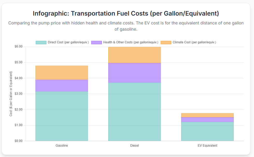 The story is the same for transportation. Figure 2 reveals that for every gallon of gasoline, we face nearly as much in hidden health and climate costs as we pay at the pump. The total cost of diesel is well over double its pump price. The electric vehicle equivalent, while not free of impact, has a total societal cost that is dramatically lower.